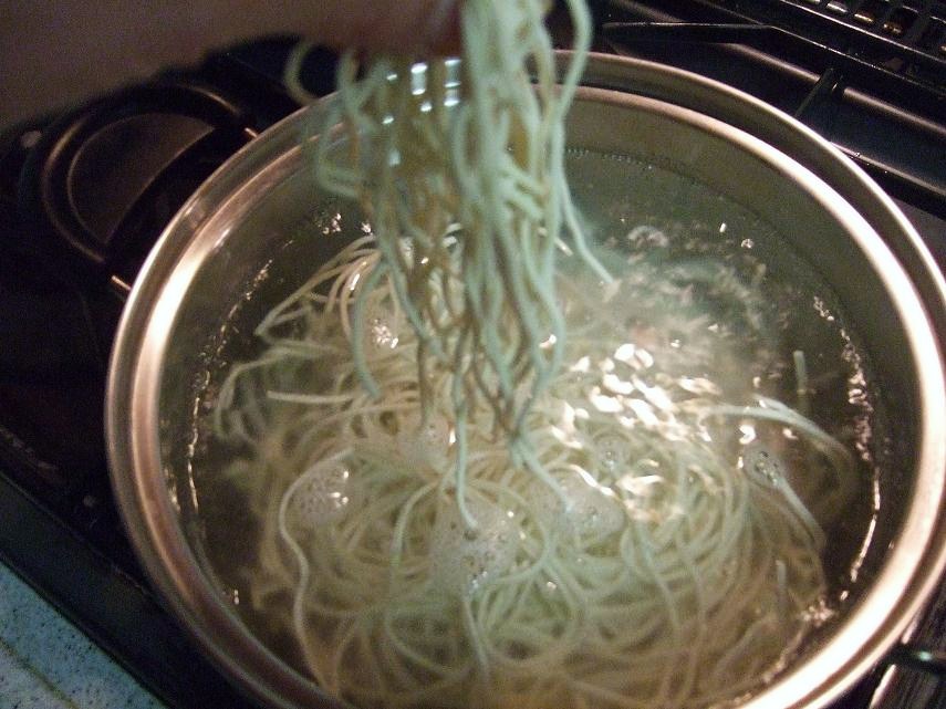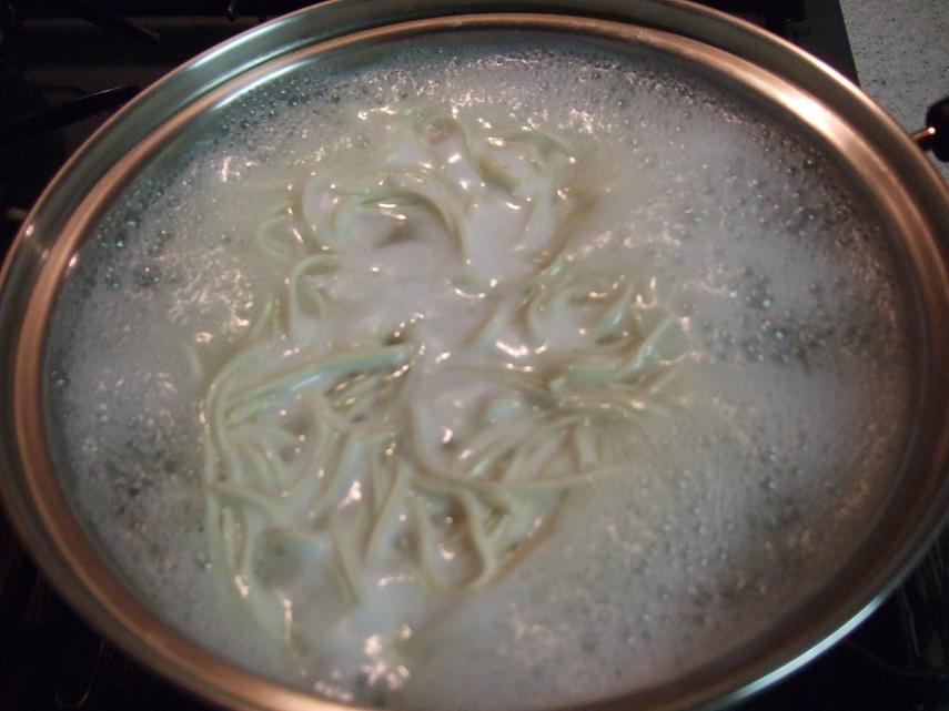 | 再度沸騰したらお湯がこぼれない程度の木加減に調節して時々かき混ぜながら、約2分半〜3分茹でます。お好みの硬さによって湯で加減は調節してください。 さし水は必要ありません。 一度に大量の麺を入れると仲間で火が通りませんので、量が多い時は面倒でも分けて茹でてください。 |