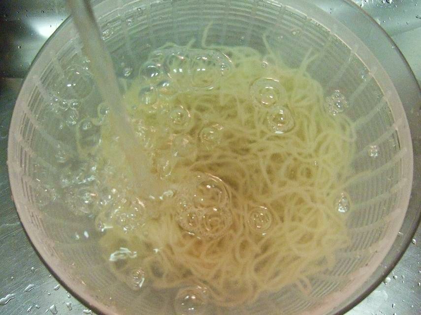 | 氷を用意しておきます。 そばが茹で上がったらザルに移し、麺が冷えるまで洗います。 |