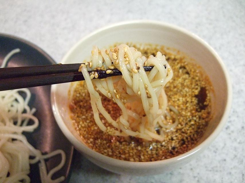| この間にラー油、ゴマを入れたたれを用意しておきます。 冬季はたれが冷たく感じるので、冷蔵庫からあらかじめ出しておいてください。ラー油が足らない場合は追加のラー油をよく振り一滴ずつ入れてください。お子に身でレモン汁を入れてもおいしく召し上がれます。 鍋の水が沸騰したらほぐしたそばを入れてかき混ぜます。 |